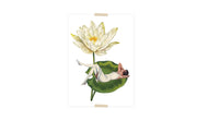 Ansichtkaart collage dametje liggend op waterlelie. Gemaakt op 300 grams recycling papier op A6 formaat. 10,5 x 14,8 cm / 4,1 x 5,8 inch. Recycling papier heeft een mooie luxe matte uitstraling en is gemaakt van 100% oud papier en is zowel met pen als potlood goed beschrijfbaar.